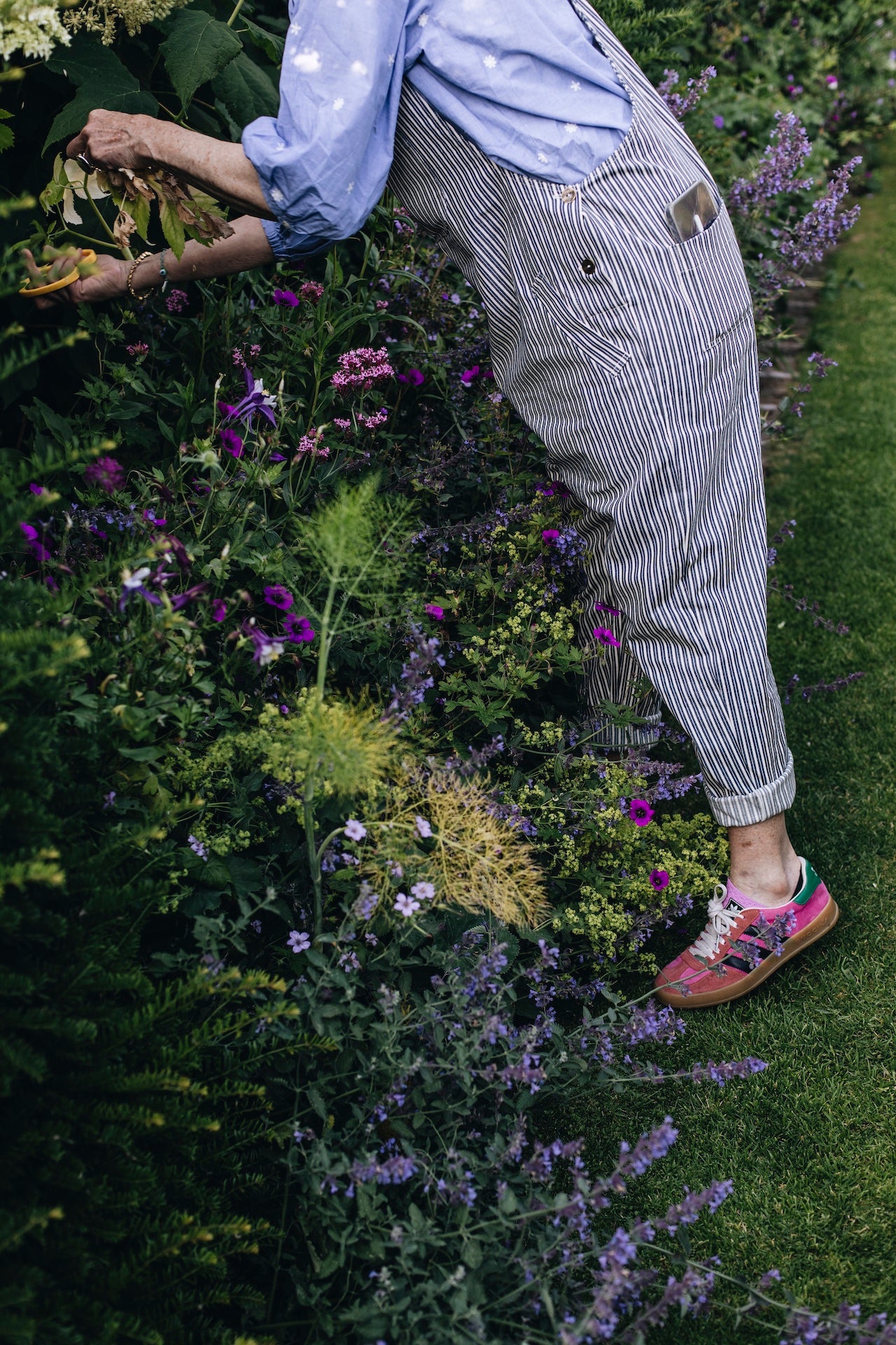 The meadow sits between a clipped lawn, mown in minutes with a battery-powered mower, and soft herbaceous borders. “It’s the contrast that makes it. That crisp edge to the wild tangle.” And tucked amongst the blooms is a discreet bowl of fresh water. “It’s for the birds and bees. You don’t see it - but they know it’s there.”